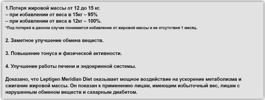 На данный момент, Leptigen Meridian Diet – единственное средство, отвечающее этим задачам. Активные микроэлементы провоцируют ускорение обмена веществ и сжигание жировой массы, а их концентрат в каждой капсуле Leptigen Meridian Diet усиливает эти процессы почти в 8 раз. Я ГАРАНТИРУЮ, что это средство – лучшее, чего добилась современная диетология. Я рекомендую его всем! Одна моя клиентка за 12 недель потеряла 38 лишних килограммов, и это в 72 года. Представляете?»