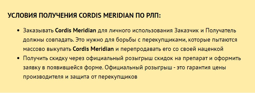 – Чтобы заказать Cordis Meridian по региональной льготной программе (РЛП) со скидкой до 100% нужно подходить по условиям: