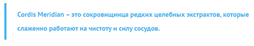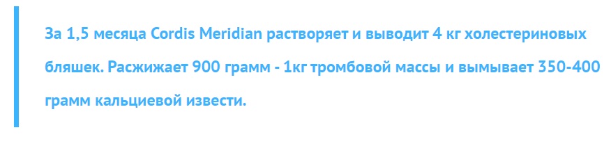 Для безопасной чистки сосудов я могу назвать только одно средство с безупречной репутацией – Cordis Meridian. Препарат продлевает жизнь на 11-17 лет, наполняя её энергией и лёгкостью, а не ценой мучений и утраты последних жизненных сил.