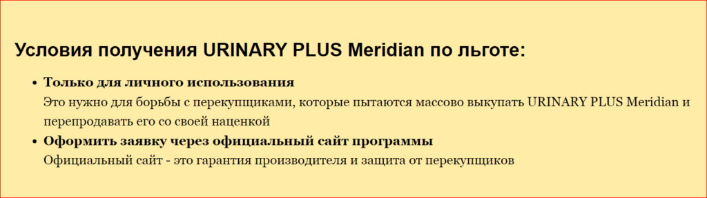 Добавлено | Примечание редакции: Важная новость! На текущий момент программа продолжает действовать. До окончания акции оригинальное средство URINARY PLUS Meridian можно получить через официальный сайт всем желающим за 0 руб по акции! Также, для удобства наших читателей, мы размещаем форму прямой заявки ниже.